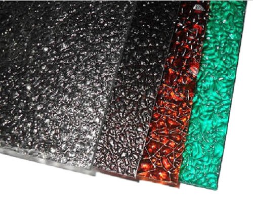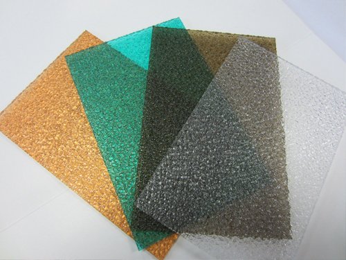 Embossed polycarbonate sheets are textured on one side, diffusing light evenly and offering privacy while maintaining brightness.